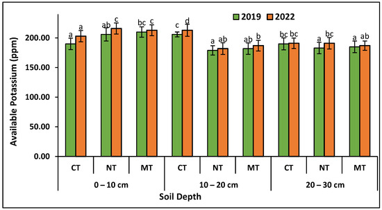 The distribution of soil-available potassium content in a 0–30 cm soil profile, followed a pattern similar to that of available phosphorus during the experiment (Figure 6). The soil available K in 0–10 cm depth was higher in the no-tillage system (214 ppm) compared to conventional tillage (190 ppm). Moreover, compared with NT, MT increased the 0–30 cm soil profile by 2%, which might be due to the mineralization and decomposition of organic matter [69]. Soil pH plays an important role in the availability of K, which was higher in soil under MT, due to H+ and hydroxyl Al ions which compete with K+ ions for adsorption or exchange centers, keeping more ions in soil solution and minimizing fixing susceptibility. Another reason for the greater available K content across soil profiles could be the addition of considerable quantities of K through straw residues [70].