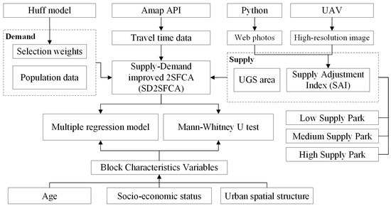 To address these shortcomings, this study first obtained basic data using advanced technologies such as Python scripting, UAV imagery acquisition, and the Amap API. Then, the 2SFCA model was improved from both supply and demand aspects, and spatial and socioeconomic inequalities of different types of UGSs were assessed separately (Figure 1). In conclusion, this study aims to provide feasible solutions for mitigating UGS inequality at a low cost and high efficiency through more accurate assessment methods of UGS inequality.