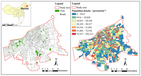 Harbin, located in northeastern China, is a significant large-scale industrial city in the country. This study selected the main urban area of Harbin as the research area (Figure 2). There are several reasons for this selection. Firstly, compared to surrounding areas, the main urban area has relatively complete urban planning and construction. It concentrates a significant number of UGS resources in the region with a high population density, making it highly meaningful for studying UGS accessibility. Second, existing UGSs in this area exhibit significant differences in scale and internal structure, aligning with the objectives of our study.