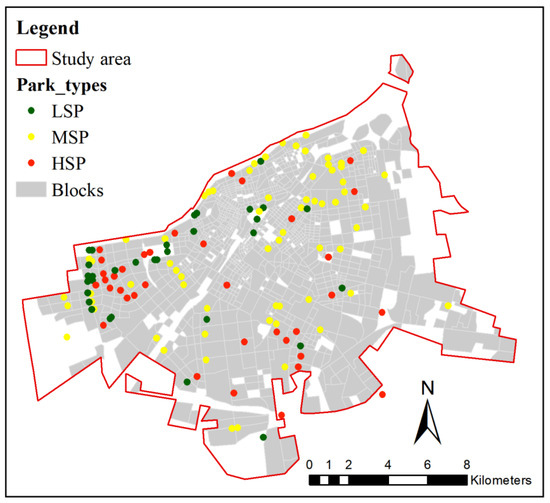 Based on the SAI, this study categorizes UGSs into three types to reflect the supply level of elements related to physical activities within UGSs. (1) Low-supply park (LSP; q ≤ 0.3): these UGS provide fewer types of services and are mainly used for residents’ daily activities nearby. They have advantages such as low construction costs, flexible site selection, and convenient use. (2) Medium-supply park (MSP; 0.3 < q ≤ 0.6): these green spaces can offer more diverse functions, such as basketball courts, children’s play facilities, fitness areas, etc., to meet the needs of different age and interest groups. They have higher construction and maintenance costs and can serve a larger range of resident activities. (3) High-supply park (HSP; q > 0.6): these green spaces have the richest functions and facilities. In addition to basic leisure functions, they may also include larger-scale activity spaces, such as large sports fields. They have the highest construction and maintenance costs and may attract a larger range of residents for activities.