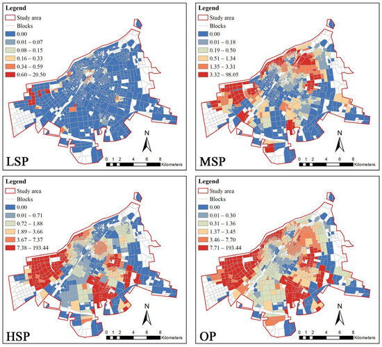 When considering the accessibility of the three types of UGSs separately, the results show that only about 11.72% of blocks can reach LSPs (Table 4), mainly distributed in the western and central parts of the city. The proportion of blocks served by MSPs is 62.18%, with accessibility generally decreasing from the suburbs toward the central urban areas, with high values concentrated in the western, riverside, and northeastern parts of the city. HSPs can serve 73.34% of blocks. Their accessibility distribution is more dispersed, with high values concentrated in the western, riverside areas, eastern, and southeastern parts.