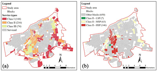 Class II: Represents blocks with access to only one class of UGS service, with relatively low accessibility, accounting for approximately 19.93% of the total. They are mainly distributed in the southern region. These blocks have relatively limited access to UGS classes, which may create significant service pressure and may not meet residents’ diverse usage preferences. Subclassification of class II results is shown in Figure 5b. Most blocks in the south can only access HSPs with limited opportunities, and a very small number of blocks can only access LSPs. In contrast, a few blocks in the east, central, and north can only access MSPs.