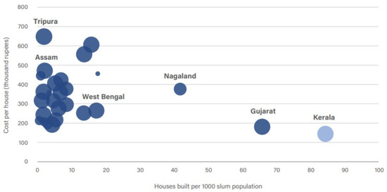 Cost and occupancy rates of BSUP housing units by state. Note: the figure is based on houses built between the start of the program in 2005 and April 2018. The size of the bubble indicates the occupancy rate. The smallest states, Chandigarh and Sikkim, are excluded.