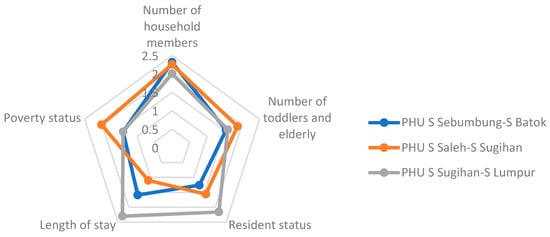 When compared among the three PHUs, the highest social vulnerability score was observed for PHU Sungai Sugihan–Sungai Lumpur, while the lowest vulnerability was observed for PHU Sungai Sebumbung–Sungai Batok. Differences in social vulnerability among the three PHUs were observed mainly for the indicators “length of stay” and “residential status”. In terms of the indicators “number of household members” and the “number of children under five and the elderly”, there were no significant differences among the three PHUs (Figure 2).