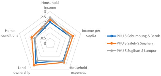 When compared among the three PHUs, the highest economic vulnerability score was observed for PHU Sungai Saleh–Sungai Sugihan. The difference in economic vulnerability scores between PHU Sungai Sugihan–Sungai Lumpur and PHU Sungai Sebumbung–Sungai Batok was not significant. The difference in economic vulnerability scores between PHU Sungai Saleh–Sungai Sugihan and the other two PHUs was mainly found in the land ownership and home conditions indicators (Figure 3).