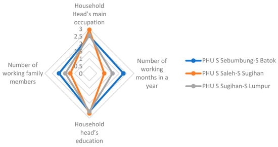 When compared among the three PHUs, the highest livelihood vulnerability score was observed for PHU Sungai Sebumbung–Sungai Batok. Between PHU Sungai Saleh–Sungai Sugihan and PHU Sungai Sugihan–Sungai Lumpur, the level of livelihood vulnerability was only slightly different. PHU Sungai Saleh–Sungai Sugihan had the lowest livelihood vulnerability score among the three PHUs. Differences in livelihood vulnerability between the three PHUs are mainly found in “the number of working household members” and “the number of working months” indicators (Figure 4).