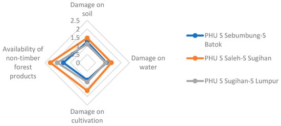 Considering the “damage to soil”, the “damage to water”, and the “damage to cultivation” indicators, results show that the ecological vulnerability in the three PHUs is relatively low. The indicator of ecological vulnerability is considered moderate based on the availability of NTFPs, especially in PHU Sungai Saleh–Sungai Sugihan and PHU Sungai Sugihan–Sungai Lumpur (Table 4).
