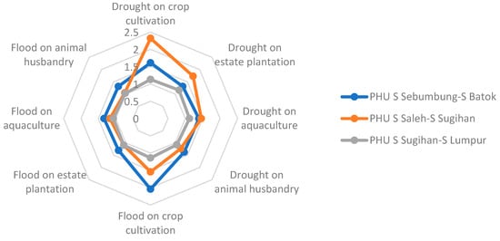 When compared among the three PHUs, the highest climate change vulnerability was observed for PHU Sungai Sebumbung–Sungai Batok, followed by PHU Sungai Saleh–Sungai Sugihan. PHU Sungai Sugihan–Sungai Lumpur has the lowest climate change vulnerability score among the three PHUs. Differences in climate change vulnerability between the three PHUs were mainly found in the “drought for agriculture” and “flood for agriculture” indicators. The influence of drought indicators on plantations only occurs in PHU Sungai Saleh–Sungai Sugihan (Figure 6).