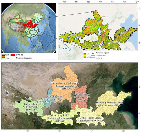 From west to east, the Yellow River flows through 9 provinces and regions, with a total length of 5464 km and an area of 795,000 km2, accounting for 8.28% of the country’s total. It is the second longest river in China and the fifth longest in the world. The Yellow River and its coastal basin are among the most important birthplaces of the Chinese nation, and they are also the main battlefield of national environmental civilization construction. In 2021, the State Council of the Central Committee of the Communist Party of China upgraded the ecological protection and high-quality development of the Yellow River Basin to a major national strategy, highlighting the strategic position of the Yellow River Basin in the overall situation of national development and socialist modernization [39]. The UAYRB consists of 7 urban agglomerations, Shandong Peninsula Urban Agglomerations (SPUA), Central Plains Urban Agglomerations (CPUA), Guanzhong Plain Urban Agglomerations (GPUA), Lanxi Urban Agglomerations (LXUA), Jinzhong Urban Agglomerations (JZUA), Hohhot–Baotou–Ordos–Yulin Urban Agglomerations (HBOYUA), and Ningxia Urban Agglomerations (NXUA) along the Yellow River (Figure 1). The seven urban agglomerations account for about 33.6% of the area of the Yellow River Basin, and the proportion of the population and main economic indicators in China’s urban agglomerations is roughly between 20% and 25%. At the same time, that of the nine provinces and regions in the Yellow River Basin is as high as 60~70% [40]. It is a high-density population-gathering area in the Yellow River Basin, an important area for high-quality economic development, a heavy-loaded area for inheriting the Yellow River culture and promoting Chinese civilization, and a key area for comprehensive environmental pollution control and ecological protection. Therefore, it has a very important strategic position in the high-quality development of the Yellow River Basin.