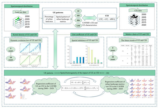This study aims to analyze the impact of UE on CEs. We adopt a series of models to assess the association between them to achieve this goal. Through these models (Figure 2), we expect to reveal the impact of UE on CEs and provide a scientific basis for formulating low-carbon development policies. To demonstrate the impact of UE on CEs in the UAYRB, this study uses the urban land area share and the landscape pattern index to characterize the spatiotemporal changes of UE, and, at the same time, we use the CEI as an indicator to analyze the changes in CEs. By calculating these indicators, we use kernel density analysis to reveal the dynamic change patterns of UE and CEI and analyze the imbalance of UE and CEI based on the Gini coefficient. In addition, we apply Markov chains to predict future changes in the trends of UE and CEI and reveal the impact of UE on CEI through the GTWR model. The core analytical approach of this study focuses on showing the changing patterns of UE and CEs in the UAYRB and further exploring the mechanism of UE’s impact on CEI.