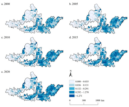 The CEIs of the UAYRB in 2000, 2005, 2010, 2015, and 2020 were 10.131, 18.191, 26.816, 30.991, and 32.712 t CO2/km2, respectively, showing a steady growing trend during the study period. The highest CEI in 2020 reached 1732.712 t CO2/km2, almost three times as much as that in 2000. However, the mean CEI of the UAYRB is no more than 40 t CO2/km2, with the highest value of only 32.712 t CO2/km2 in 2020. The standard deviation of CEI in the study period exhibited a rocketing upward trend, indicating an obvious spatial difference in the CEI of the UAYRB. Spatially, the high CEI was concentrated in the SPUA and CPUA and scattered in the GZUA and JZUA during the study period (Figure 3). As time went by, the CEI in these areas showed an increasing trend, while the proportion of high CEI increased accordingly. The SPUA and CPUA showed the most obvious change characteristics. The regions with low CEI west of the HBOYUA, west and the north of the LXUA, and south of the NXUA exhibited no evident changes during the study period.