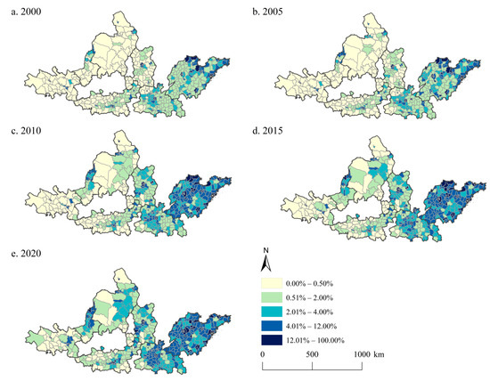 The proportions of urban land in the UAYRB in 2000, 2005, 2010, 2015, and 2020 were 6.7%, 7.8%, 10.3%, 10.8%, and 11.4%, respectively, showing an obvious increasing trend during the study period (Figure 4). Similar to the spatial pattern of CEI, the regions with a high proportion of urban land were concentrated in the SPUA and CPUA. Meanwhile, some major cities of the other urban agglomerations also have a high proportion of urban land. Over time, the spatial pattern of the regions with a high proportion of urban land showed a westward expansion trend. The SPUA and CPUA were still urban agglomerations with the most significant changes. Compared to the study period of 2000–2005, 2005–2020 witnessed the proportion of urban land increasing more evidently.