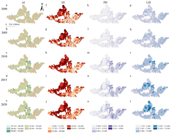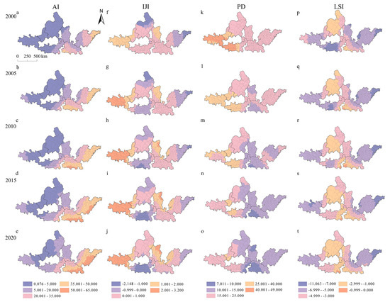 Spatial pattern of urban landscape metrics in the UAYRB during 2000–2020.