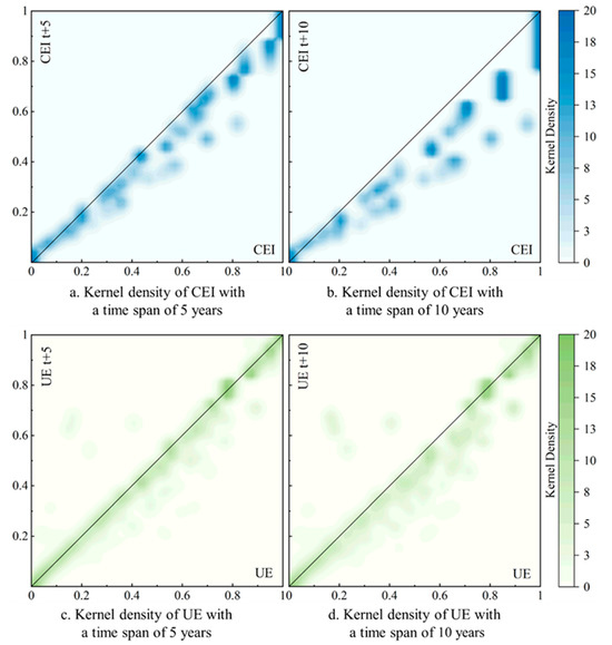 Kernel density contour map of CEI and UE. (a) is the kernel density of CEI with a time span of 5 years. (b) is the kernel density of CEI with a time span of 10 years. (c) is the kernel density of UE with a time span of 5 years. (d) is the kernel density of UE with a time span of 10 years.