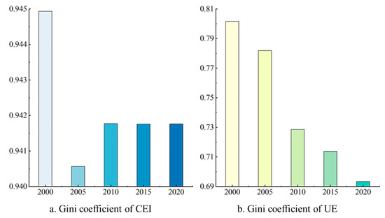 The Gini coefficient is often used to measure the degree of imbalance and insufficiency of regional economic development [50]. This study introduced the Gini coefficient to analyze the CEI and the spatial imbalance of the UE of the UAYRB. The Gini coefficient is applied to assess the uneven spatial distribution of UE and CEI, thus revealing the uneven spatial distribution of UE on CEI. It can provide us with a new perspective to understand the relationship between UE and CEI.