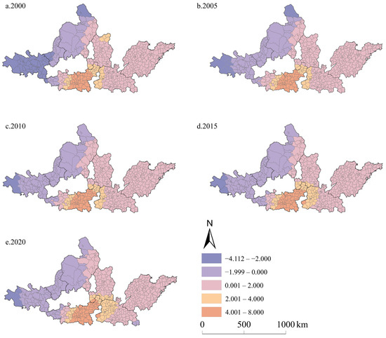 Regression coefficient of UE on CEI in the UAYRB during 2000–2020. (a–e) are the regression coefficient of UE on CEI in the UAYRB in 2000, 2005, 2010, 2015, and 2020, respectively.