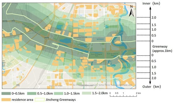 Located in Southwest China, Chengdu accommodates more than 21 million people within an area of 14,335 square kilometers. For decades, its urban area has been expanding rapidly following a concentric pattern. The city center has remained the core area, and newly developed land is organized in a circular structure of beltways. In 2017, the Chengdu Municipality initiated the Tianfu Greenway Scheme, aiming at a 16,930-km greenway network, of which the Jincheng Greenway was one primary project. Serving as a belt surrounding the city, the Jincheng Greenway spans an area of 187.15 square kilometers. Delegated by the municipal government, Chengdu Tianfu Greenway Construction Investment Co., Ltd. (Chengdu, China), a state-owned enterprise, is responsible for the development and management of the Jincheng Greenway. According to the official plan, the Jincheng Greenway project includes 500-km trails, a 20-square-kilometer water area, a 100-km ecological agriculture landscape, 640 cultural facilities, 1050 sports facilities, and 410 tourism facilities [29,30]. The Jincheng Greenway is now a 1-km-wide and 85-km-long green belt along both sides of the fourth beltway. There are 1349 residential communities located within a 3-km radius along the Jincheng Greenway (see Figure 1).