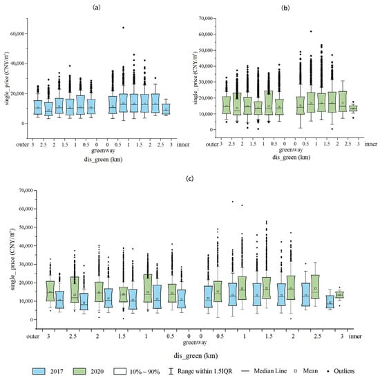 Boxplot analysis of preowned apartment prices along the Jincheng Greenway. (a) shows housing price data for 2017, (b) shows housing price data for 2020, and (c) illustrates a comparison of housing price data between 2017 and 2020.