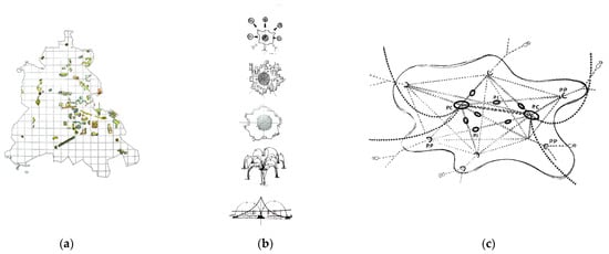(a) Archipelago: islands and streets by Ungers O.M. and others; (b,c) De Carlo G., central and peripheral nodes by De Carlo (public domain).