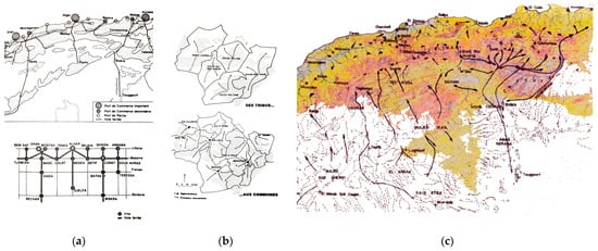 Particularly interesting, in terms of study on the form and the relationship between territory and city, is the contribution of Marc Cote [31], a relatively unknown figure (Figure 2a,b). Cote was a lecturer at the University of Aix-en-Provence. Cote examined the relationship between natural space and paths within the dynamic context of Algerian territory. Cote also understood and represented the contrast between the pre-colonial relational system and the colonial imposition3. This upheaval overturned the physio-political, administrative, and socio-economic structure of the indigenous territory. Cote graphically represented this overlay of two models, showing how centers and boundaries, settlements, and paths were closely linked to two different ideas of human space and change in the indigenous area. This area, previously based on a delicate balance between parts of the territory (Figure 2c), was altered by new alien statutory boundaries, functional only to cultural and economic dominance logic. This imbalance continues to hinder the recovery of a centuries-old relationship between man and territory.