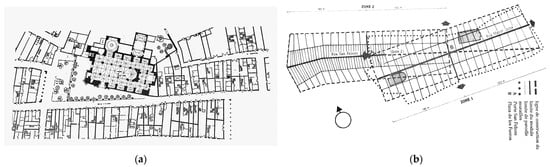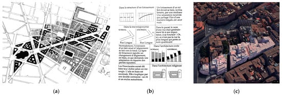“D’une manière générale, les travaux de morphologie urbaine ont été surtout préoccupés par la notion de continuité urbaine, à travers la permanence des structures, des tracés (viaires, parcellaires …), leur rôle et leur influence dans la détermination des formes successives (processus de sédimentation): on les retrouve dans les concepts de «processus typologique» (…) chez Caniggia” [19] (Figure 5a,b).