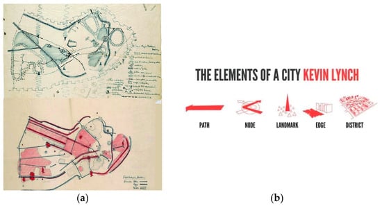 Bartres highlighted and recalled how little attention urban research had devoted to these studies, noting that only an urbanist and city scholar like Kevin Lynch (Figure 4a,b) attempted to attribute meaning to the city beyond simple metaphors. “Formal units and classes” are the terms Lynch uses to grasp what about the city could be useful in understanding the mechanisms of formation and combination, defining objects and forms that have been deemed important by numerous others approaching urban morphology studies in various capacities. These are terms that Lynch identifies in paths, edges, districts, nodes, and landmarks [19]. These are elements of the urban narrative with stone that we can similarly consider in notes and drawings about the territory and type and also in the Italian school of morphology.