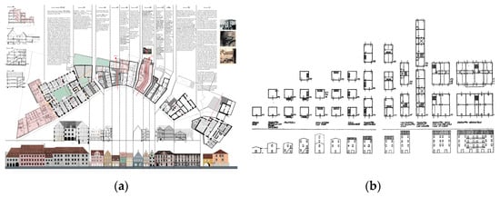 (a) Landshut: Urban form and typology analysis by Carlotti; Shiva. (b) Abacus of the typological process of the base building, by Caniggia G.; Maffei G.L. (public domain).