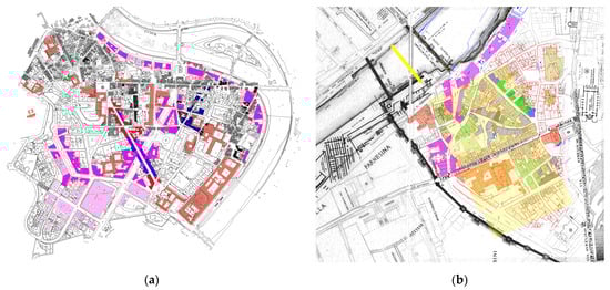 (a) Roma, Trastevere. The “viale del re” juxtaposed with the ancient fabric connects the city center with the train station by the author. (b) Roma, Trastevere (pink). The avenue of “Santa Dorotea” connects two polarities: the Sisto Bridge and Via della Lungara. By the author.