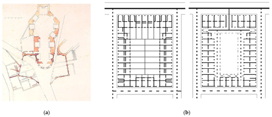 An osmotic relationship links the basic building fabric to the special building, commonly referred to as a palace. It represents a continuous genetic mutation of the building within the urban fabric, altering the rules for aggregating basic units within the building fabric proposing different, sometimes simpler, or more complex alchemies over time. The transition to a special architectural unit is generally determined during the procedural history of the architectural type through a simple and paratactic juxtaposition of building cells (Figure 11a,b).