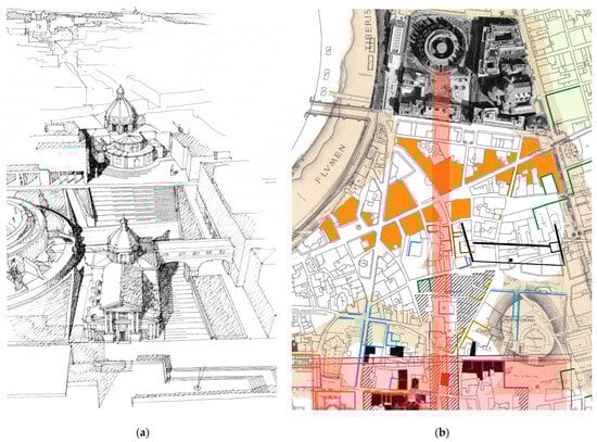 In line with processes and events that change its course, the foundation of urban acupuncture is analogous to the concept of process in urban morphology and interventions that have understood the significance and role of the part within the whole. Profiting from corrections to heal wounds is what morphological studies seek to explore through the study of form. However, not all interventions manage to achieve this, lacking that touch of genius. Others, on the other hand, seem to have both this touch and the ability to meet the goals set by morphological studies. One such project led by Francesco Cellini at the Augusteum managed to blend different historical layers of the city of Rome with the demands of the most recent contemporary layer (Figure 12a,b). This was achieved through connecting pathways, scalar connections that reinterpret the ancient by inventing the new. The city, in its continuous transformation, preserves in the forms of its original structure the imprint of its future, often linked to the original plastic conditions of the soil that continue to suggest tactical and strategic interventions, acupuncture points characterizing new points of an archipelago [10].