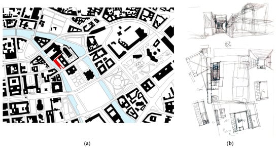 (a) Chipperfield D. & Schwarz A., Berlin Neues Museum Urban Planimetry. (b) Sketch of the project. By Schwarz A.