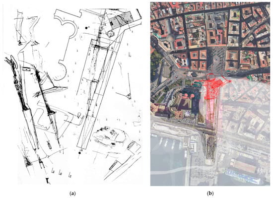 Different but equally expressive of an acupuncture design tension, halfway between urban design and landscape rewriting, is the one by Siza and Souto de Moura for the Municipio station in Naples, still unfinished, which has united fragments of Naples’ history (Figure 14a,b). A complex project where, once again, the fragment, the gap, and urban regeneration find a masterful synthesis in the redesign of a node belonging to the city system and through the metro station to the wider territory. “(…) a project of ‘historical continuity’. Not figuratively, but in the way of working. Christian architects of the Middle Ages, for example, used to take Roman columns to build churches. Well, we use archaeology not as a field of investigation, not as material for scientific contemplation, but as material useful for our projects” [42].