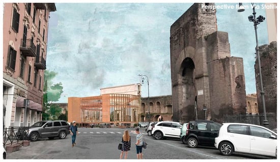 Finally, I would present the experimental design work conducted for a master’s thesis, which I tutored, along with two colleagues, in the field of restoration, focused on the objective of transforming a marginal urban space into a central hub through an innovative approach to design: urban acupuncture. Specifically, our focus was on the revival of Porta Maggiore in Rome, an area long considered an urban boundary (Figure 15 and Figure 16). Through the study of urban morphology, we highlighted the potential of this location, which has gradually but steadily evolved into a vital convergence point within the Eternal City since the unification of Italy. The design experimentation was centered around the idea of infusing this space with the typical vitality and centrality found in Roman squares. Through careful analysis of the historical and urban context, we worked to conceive a project that not only addressed contemporary needs but also valued and respected the identity and history of the site, distinguishing the area within the walls from that outside the city’s perimeter.