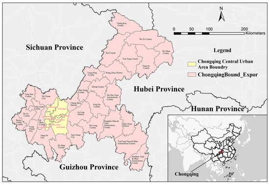 Chongqing is the area under investigation in this study. Chongqing is located on the eastern edge of the Sichuan Basin, a transition zone between the Qinghai–Tibet Plateau and the middle and lower reaches of the Yangtze Plain, in West–Central China, between 28°10′ and 32°13′ N, 105°17′ and 110°11′ E. It comprises 38 administrative districts, including 24 districts and 14 counties, with an area of about 82,403 km2 (Figure 1). Chongqing had a population of over 32 million in 2022. The urbanization rate was 70.96% in 2022.
