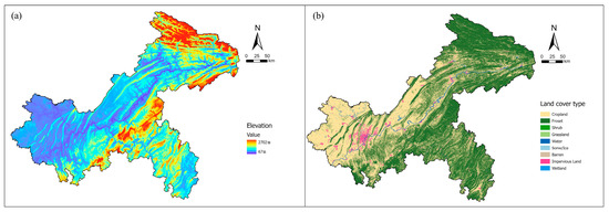 (a) The elevation in Chongqing; (b) The land cover type in Chongqing.