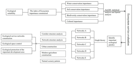 In this study, the ecological network in Chongqing was established by coupled ecosystem services, including water conservation, soil conservation, biodiversity conservation, and cultural ecosystem services, with network analysis to alleviate the contradiction between land use and ecological conservation in rapid urbanization. First, ecological suitability analysis was applied to comprehend the constraints and suitability under the ecological priority scenario in mountain regions. Second, the importance and spatial distribution of 4 types of ecosystem services were investigated via ecosystem services importance analysis using non-monetary approaches. Important ecological service areas were identified based on a comprehensive analysis of ecological suitability and an assessment of integrated ecosystem services. Important ecological source areas were simplified as nodes to construct ecological network scenarios with the graph theory. Ecological network scenarios’ structure, connectivity, and effectiveness were assessed with network analysis. Finally, an optimal scenario was obtained. Control measures for key ecological spaces and construction strategies for crucial development areas were proposed. The technical pathway is described in Figure 3.