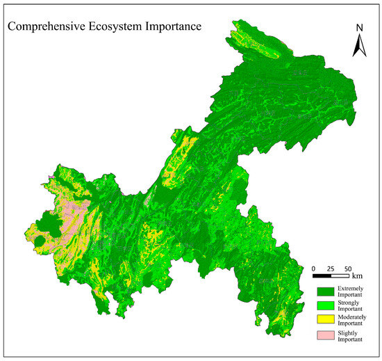 The importance of biodiversity conservation is represented in Figure 5c. Approximately 81.54% of the areas were deemed slightly important, primarily distributed in urban clusters where human activities exert significant influence. These areas are characterized by high population density and intense production and living activities. These moderately important areas were mainly distributed in a strip in the central region of Chongqing. Around 6.58% of the areas were considered strongly important, with an irregular distribution in Chongqing’s central and southeastern parts. The remaining 5.84% of areas marked as extremely important were mainly concentrated in nature reserves northeast and southeast of Chongqing. The strongly and extremely important areas are predominantly clustered in mountainous regions with high vegetation cover and away from urban built-up areas, primarily along the Yangtze and Jialing Rivers. These areas experience minimal human disturbance, possess excellent vegetation coverage, and maintain a high level of biodiversity.