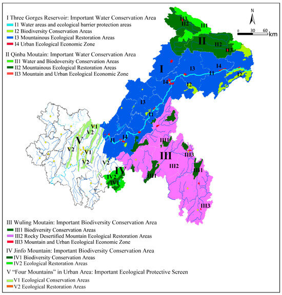 To ensure the ecological security functions of ecosystem services in Chongqing, we identified five key ecological function areas through assessments of ecosystem service importance, land use conditions, and ecological suitability analysis. The selection criteria were derived from the assessment results of biodiversity conservation, soil conservation, and water conservation: Table 10 and Figure 9 list five key ecological function areas and their dominant and auxiliary functions. Beginning with the goal of curbing the trend of ecological degradation and enhancing the recovery of key ecological function areas, we proposed control measures for these ecological lands. Examples of these measures include the following: The Three Gorges Reservoir area primarily provides ecosystem services such as water conservation and biodiversity preservation, with flood regulation following closely. The ecological security of this area is crucial for ensuring the ecological safety of the middle and lower reaches of the Yangtze River. Therefore, priority should be placed on ecological environmental protection, particularly in the post-Three Gorges era. Tailored development of characteristic industries should be promoted, considering the capacity of local resources and the environment, with strategic and targeted approaches. It is essential to effectively protect the reservoir area’s water environment and aquatic ecological security. This includes constructing ecological barriers around the Three Gorges Reservoir and strengthening comprehensive management of geological disasters, soil erosion, and desertification. Such measures are essential for maximizing the functions of the Three Gorges Project, including flood control, power generation, navigation, and the provision of clean freshwater resources, ensuring its long-term stable operation.