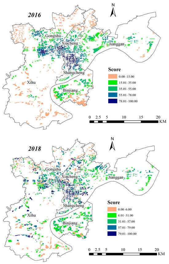 Figure 2 presents an improved trend of the overall walk score from 2016 to 2018 within the Hangzhou metropolitan area. In 2016, from the central area to the suburb, there was a significant circle-like distribution pattern of walkability from high to low. Specifically, the overall walk score was higher within the Shangcheng and Xiacheng districts, while that in Jianggan, Binjiang, and Gongshu was lower. In 2018, the overall walk score of the Xihu district was largely improved, but in Binjiang and Jianggan, it was still relatively low.