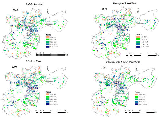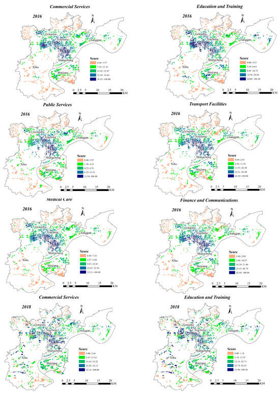 As exhibited in Figure 3, the subtype walk score showed similar distribution characteristics with the overall walk score. To be specific, in 2016, the Shangcheng and Xiacheng districts generally had a higher subtype walk score of the six categories. With respect to the community commercial services subtype walk score, it was higher in the northern part of the Xihu district. For the community education and training subtype walk score, the northern part of Xihu and the central area of Binjiang were higher, while the peripheral areas of the Xihu district and Gongshu districts were lower. For the community public services subtype walk score, the northwest part of the Xihu district and the southern part of the Gongshu district were higher, while the northern part of the Jianggan district was lower. The community transport facilities subtype walk score, the community medical care walk score, and the community finance and communication walk score also presented similar spatial patterns. In 2018, the Shangcheng and Xiacheng districts still presented higher subtype walk scores of the six categories. The majority of the communities have seen increased subtype walk scores compared with 2016, especially those within the Xihu district.