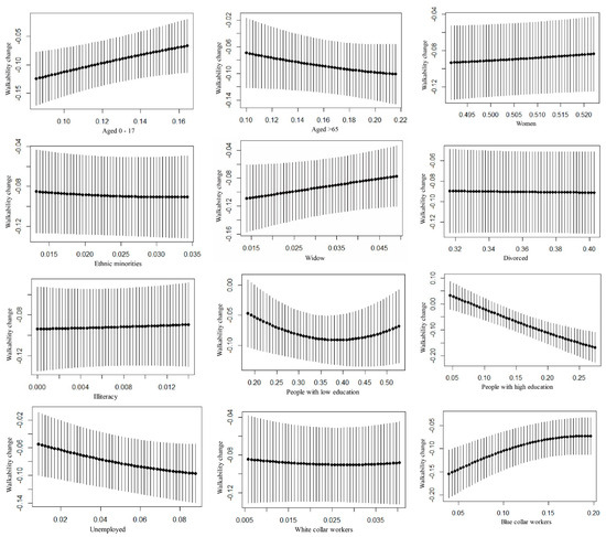 For the relationship between subtype walkability and neighborhood deprivation, we found that the community public services walkability change and the community medical care walkability change had no significant relationship with deprivation. But for the other four types of walkability changes, people aged over 65 years old, ethnic minorities, and people with high education were typically disadvantaged groups that showed a negative relationship with the community walkability change. Divorced people, unemployed people, and white-collar workers were typically advantaged groups that showed a positive relationship with the walkability change. These results were consistent with the previous study conducted by Rundle et al. [51] and Engel et al. [52]. Another discovery was that the subtype walkability had different relationships with neighborhood deprivation. Among them, children and divorced individuals were still exposed to a deprived transport walkability environment. What is more, regarding the interactions among the deprivation indicators, we distinguished that marriage status and age were the key indicators in predicting neighborhood walkability changes over time. These indicators interact closely with other deprivation indicators and can be used as essential references for formulating planning guidelines. Studies have shown that infrastructure construction for a walkable environment can promote people’s willingness to travel [44]; it can promote residents’ mobility and health by providing appropriate services for walkers [53]. Since the social inequality in neighborhood walkability still exists, more policies and planning will be needed to solve these problems. For example, for the neighborhoods with higher concentrations of children, urban planners are expected to provision more transport amenities to enhance walkability. Besides, our study found that elderly individuals were still restricted from improved walking environments, especially in the context of China’s severe aging society [54,55]. The walking environment of the elderly is the first urgent concern. Therefore, since the quality of the walking environment is dependent on several different factors [56], we should not only increase the number of facilities and improve road conditions to reduce the travel distance [57], but also increase the comfort of the walking environment by adding benches, so as to improve the walking environment and travel willingness of the elderly [58].