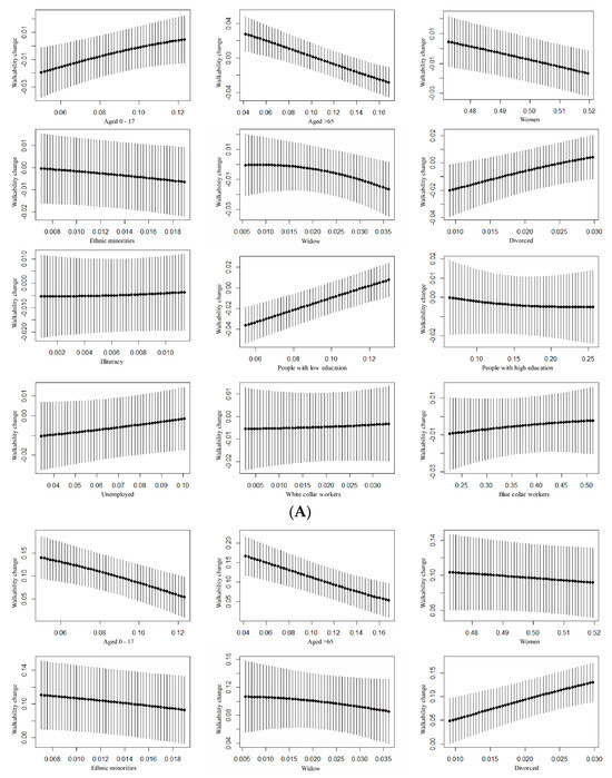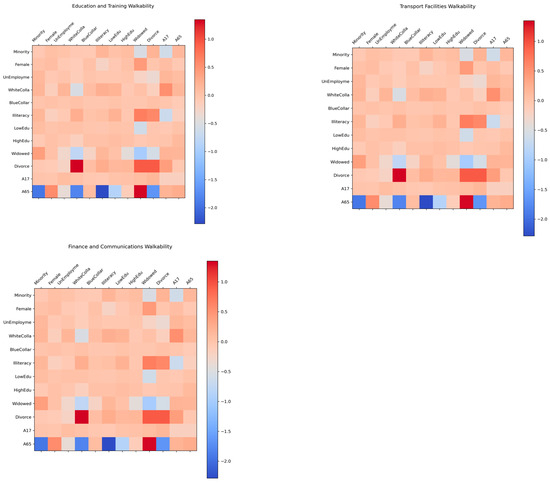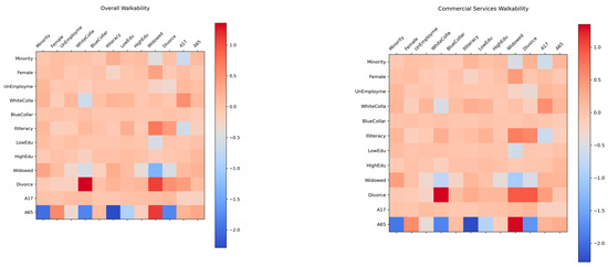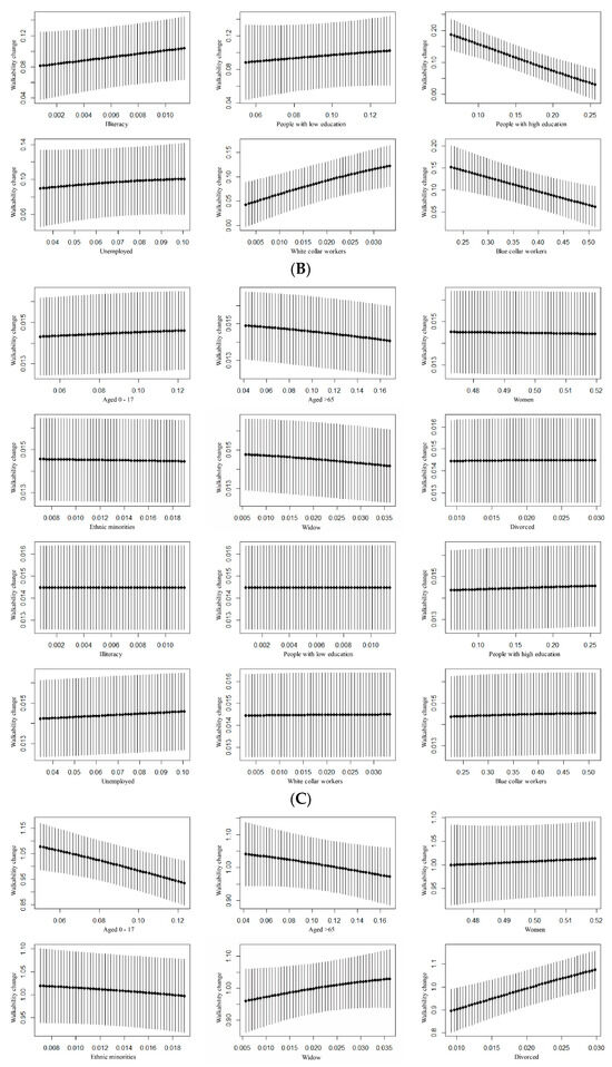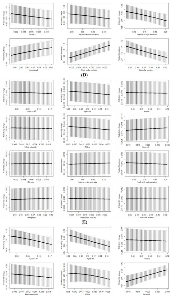 Figure 6 exhibits the interactions among neighborhood deprivation indicators. A consistent tendency is observed for the overall walkability and subtype walkability. To be specific, a positively higher contribution is found for the interaction between the proportion of divorced individuals and the proportion of blue-collar workers, between the proportion of divorced individuals and the proportion of illiteracy, as well as between the proportion of divorced individuals and the proportion of elderly people aged over 65. This indicates that marriage status should interact with age, education, and occupation closely in explaining neighborhood walkability changes. This also suggests that neighborhoods with deprivation in these four dimensions are prone to experience improved overall and subtype walkability. On the contrary, the interactions between the proportion of elderly people aged over 65 and other deprivation indicators contribute to walkability changes in a negatively high manner. This confirms the results presented in Figure 5 and further highlights that the multidimensional deprivation in walkability should be more significant in neighborhoods with higher concentrations of elderly people.