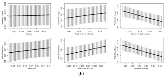 Figure 5. (A) The relationship between commercial services walkability change and neighborhood deprivation. (B) The relationship between education and training walkability change and neighborhood deprivation. (C) The relationship between public services walkability change and neighborhood deprivation. (D) The relationship between the transport facilities walkability change and neighborhood deprivation. (E) The relationship between medical care facilities walkability change and neighborhood deprivation. (F) The relationship between the finance and communication walkability change and neighborhood deprivation.