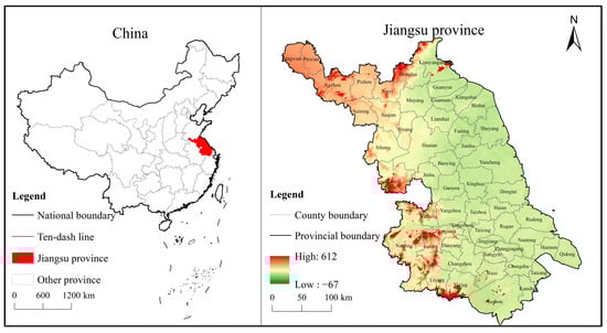 Jiangsu Province is situated in the eastern coastal region of mainland China, with latitude ranging from 30°45′ to 35°08′ N and longitude ranging from 116°21′ to 121°56′ E (Figure 1). As of 2020, the province had a total area of 102,521.20 km2, with a cultivated land area of 62,773.09 km2, accounting for 61.22% of the total area. Known for its flat terrain, favorable climate, and abundant water resources, Jiangsu Province is well-suited for agricultural production. Between 2000 and 2022, the sown area of grain in Jiangsu Province varied from 53,043.1 km2 to 54,444.4 km2. During this period, the total grain output is expected to change from 31,066,300 tons to 37,691,300 tons, and the total output value is anticipated to shift from USD 4379 million to USD 19,884 million. However, in recent years, rapid socio-economic development and increasing urbanization have led to the conversion of some of Jiangsu Province’s cultivated land into artificial surfaces (ASs) like urban and rural residential land [28]. This, along with the prominent issue of NGP, has posed a serious challenge to food security in the region. Protecting cultivated land resources and ensuring stable grain production in Jiangsu Province are of utmost importance for national food security and the sustainable development of the national economy.