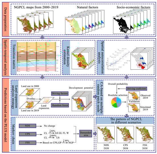 We analyzed the spatial and temporal evolution of NGP in Jiangsu Province from 2000 to 2019 and predicted the pattern of NGP under different scenarios for 2038. First, the spatial location of NGPCL was identified and the NGPR was calculated for each county. Then, land use transfer matrix, kernel density estimation (KDE), and spatial autocorrelation analysis were used to reveal the spatio-temporal evolution pattern of NGP. Finally, the PLUS model was used to simulate the different future scenarios of the NGP pattern. The general framework of the study is shown in Figure 2.