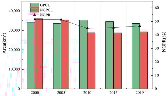 Between 2000 and 2019, the cultivated land area in Jiangsu Province decreased from 69,910.29 km² to 62,777.79 km². The NGPCL decreased by 18.67% from the initial year, while the NGPR decreased from 51.48% to 46.63% (Figure 3). The temporal evolution characteristics of NGP suggest two phases during the study period.
