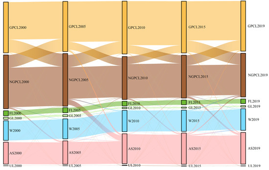 The data presented in Figure 4 indicate that the mutual transformation between NGPCL and GPCL was a common occurrence across all time periods studied. The data from Table 3 reveal that during the period of 2000–2019, NGPCL accounted for 76.33% of the transfer out of GPCL to other land categories, while the conversion of NGPCL to GPCL represented 63.18% of the outward transfers from NGPCL. Additionally, the conversion of cultivated land to AS constituted a significant proportion, with 20.69% of GPCL outward transfers and 30.86% of NGPCL outward transfers resulting in AS. These findings suggested that the expansion of AS during the study period led to a common occurrence of cultivated land being converted, with NGPCL being more prone to transformation into AS compared to GPCL.