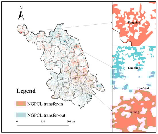 As shown in Figure 6, the patches with decreasing NGPCL were mainly located in Lianyungang, Guanyun, and Gunnan in northeastern Jiangsu and Nanjing, Suzhou, and Wuxi in the south, while the areas with increasing NGPCL were mainly located in Rugao, Taixing, and Xinghua in central Jiangsu and Fengxian, Peixian, and Pizhou in the northwest.