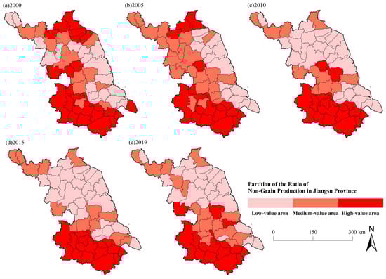The county NGPR was used to classify the 54 county units into low-value areas (40% ≤ NGPR), medium-value areas (40% ≤ NGPR ≤ 58%), and high-value areas (NGPR ≥ 58%) based on the natural breakpoint method, as shown in Figure 8. Throughout the study period, the high-value zones decreased from 24 in 2000 to 15 in 2019, while the medium-value zones increased by 6, and the low-value zones increased by 3. In terms of spatial distribution, Jiangsu Province underwent a shift from “high NGPR in the north and south and lower in the center” to “high NGPR in the south and center and lower in the north”. Across the entire study period, the southern part of Jiangsu exhibited a higher degree of NGP, primarily concentrated in the high-value areas. Cities like Nanjing and Suzhou remained in the high-value area for an extended period. In central Jiangsu, the NGPR was lower in 2000 but increased over time. Cities such as Taizhou and Taixing transitioned from the low-value area to the middle-value area, while Xinghua and Haian shifted from the middle-value area to the high-value area. In the northern part of Jiangsu, the NGPR was higher in 2000 but experienced a decline over time. Locations like Donghai, Guanyun, and Gunnan shifted from being high-value areas to low-value areas during this period.