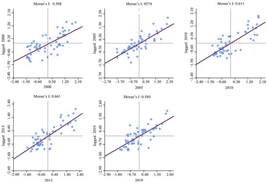 Local spatial autocorrelation involves four distinct patterns: high–high agglomeration (H-H), low–high agglomeration (L-H), low–low agglomeration (L-L), and high–low agglomeration (H-L). H-H and L-L signify positive spatial correlation, indicating clustering of similar high or low values, whereas H-L and L-H suggest negative spatial correlation, reflecting dissimilar neighboring values. We utilized Moran scatter plots and LISA clustering diagrams to provide a comprehensive analysis of the local spatial correlation attributes in the context of NGP.